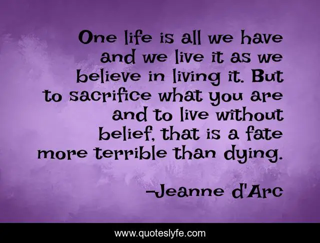 This page presents the quote "One life is all we have and we live it as we believe in living it. But to sacrifice what you are and to live without belief, that is a fate more terrible than dying.". Author of this quote is Jeanne d'Arc. This quote is about historical, legendary, inspirational, enthusiasm, feminism, women,.