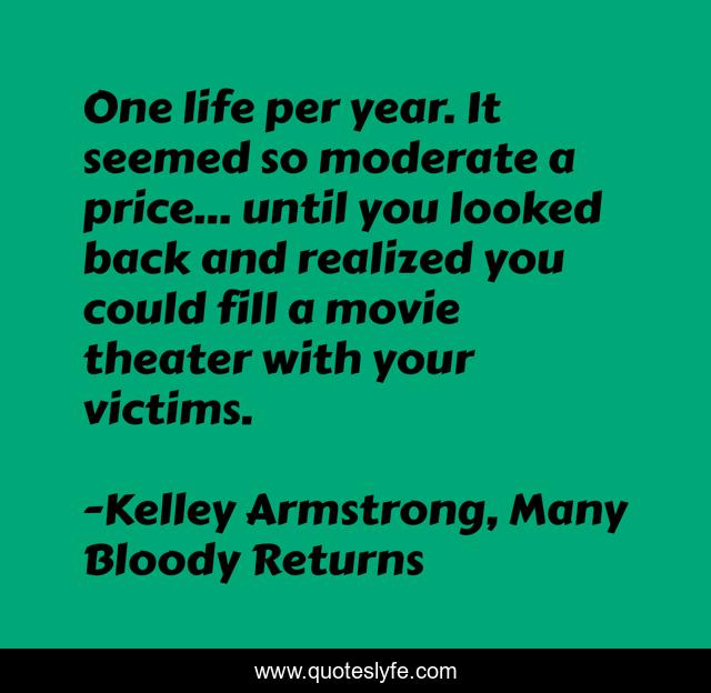 This page presents the quote "One life per year. It seemed so moderate a price... until you looked back and realized you could fill a movie theater with your victims.". Author of this quote is Kelley Armstrong, Many Bloody Returns. This quote is about vampires, cassandra-ducharme,.