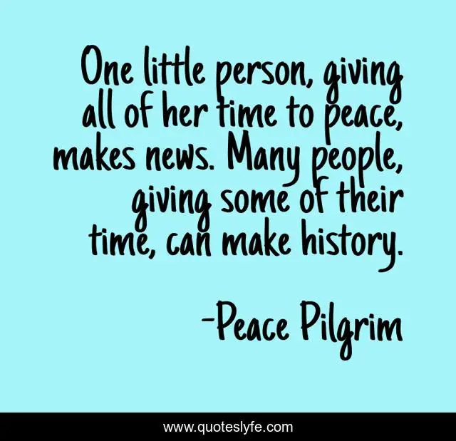 This page presents the quote "One little person, giving all of her time to peace, makes news. Many people, giving some of their time, can make history.". Author of this quote is Peace Pilgrim. This quote is about giving, peace, time,.