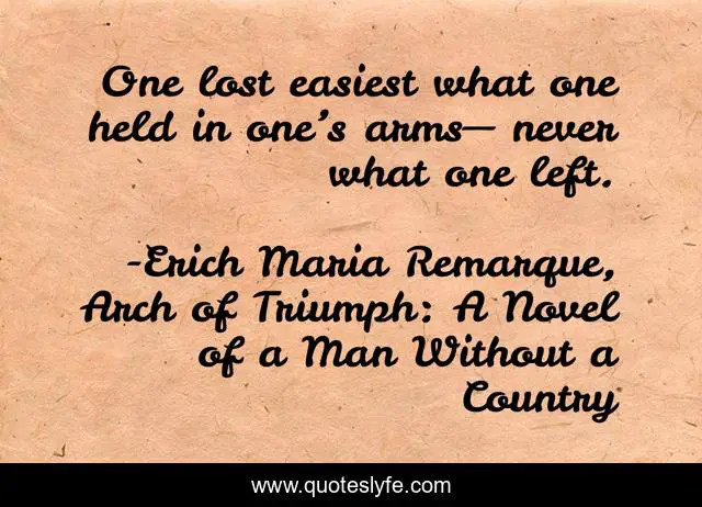 This page presents the quote "One lost easiest what one held in one’s arms— never what one left.". Author of this quote is Erich Maria Remarque, Arch of Triumph: A Novel of a Man Without a Country. This quote is about heartache, loss, love, affection,.