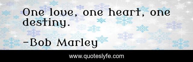 This page presents the quote "One love, one heart, one destiny.". Author of this quote is Bob Marley. This quote is about heart, love, destiny, compassion, bob-marley, inspirational, enthusiasm, humanity, affection,.