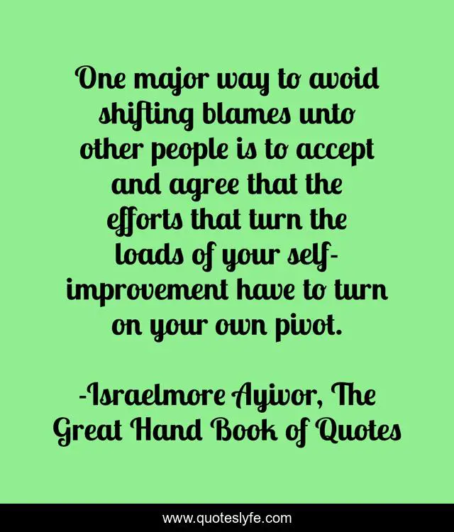 This page presents the quote "One major way to avoid shifting blames unto other people is to accept and agree that the efforts that turn the loads of your self- improvement have to turn on your own pivot.". Author of this quote is Israelmore Ayivor, The Great Hand Book of Quotes. This quote is about major, people, one, be-responsible, food-for-thought, do-it-yourself, avoid, responsible, do-it,.