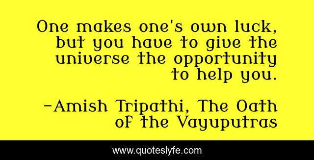 This page presents the quote "One makes one's own luck, but you have to give the universe the opportunity to help you.". Author of this quote is Amish Tripathi, The Oath of the Vayuputras. This quote is about enthusiasm, luck, inspirational, wisdom,.