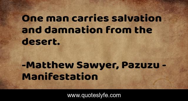 This page presents the quote "One man carries salvation and damnation from the desert.". Author of this quote is Matthew Sawyer, Pazuzu - Manifestation. This quote is about possession, pazuzu, horror, demon, evil, messiah, fantasy, monsters,.