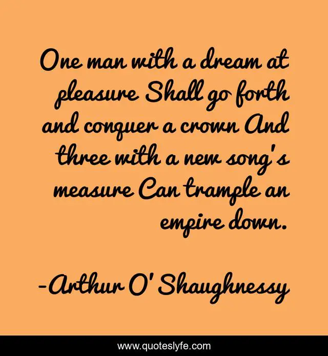 This page presents the quote "One man with a dream at pleasure Shall go forth and conquer a crown And three with a new song's measure Can trample an empire down.". Author of this quote is Arthur O'Shaughnessy. .