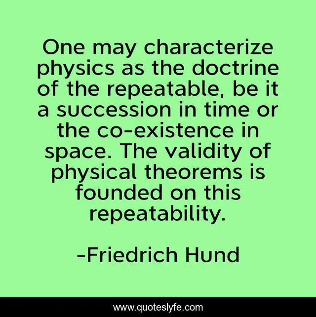 This page presents the quote "One may characterize physics as the doctrine of the repeatable, be it a succession in time or the co-existence in space. The validity of physical theorems is founded on this repeatability.". Author of this quote is Friedrich Hund. This quote is about space, science, repeatability, validity, theorem, physics,.
