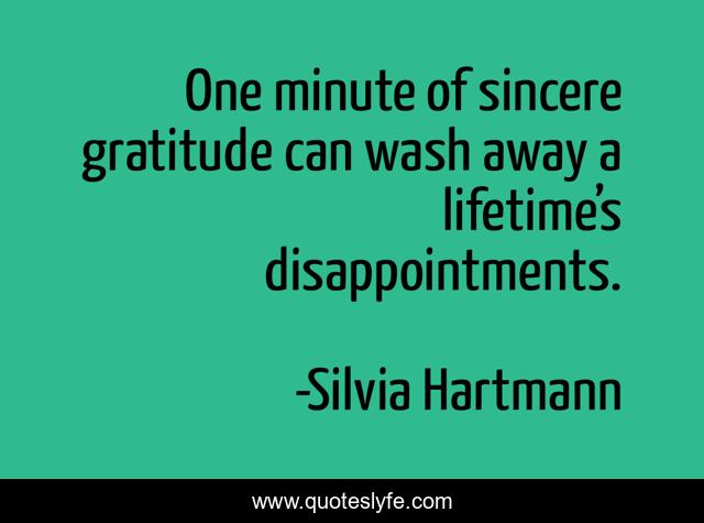 This page presents the quote "One minute of sincere gratitude can wash away a lifetime’s disappointments.". Author of this quote is Silvia Hartmann. This quote is about gratitude, event, moment, disappointment, life-changing,.