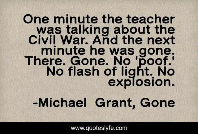 This page presents the quote "One minute the teacher was talking about the Civil War. And the next minute he was gone. There. Gone. No 'poof.' No flash of light. No explosion.". Author of this quote is Michael Grant, Gone. This quote is about fantasy, survival, first-sentence, gone-series, teens,.