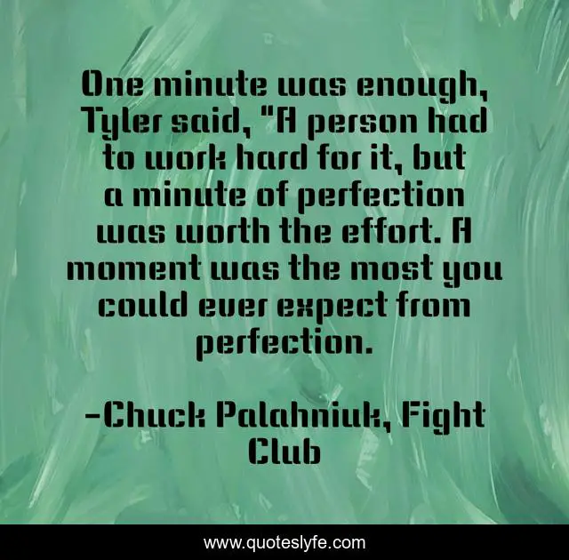 This page presents the quote "One minute was enough, Tyler said, "A person had to work hard for it, but a minute of perfection was worth the effort. A moment was the most you could ever expect from perfection.". Author of this quote is Chuck Palahniuk, Fight Club. This quote is about perfection, deep-thought,.