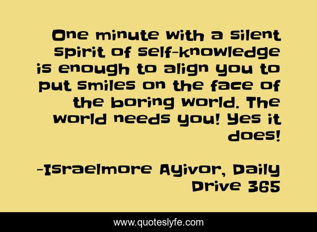 This page presents the quote "One minute with a silent spirit of self-knowledge is enough to align you to put smiles on the face of the boring world. The world needs you! Yes it does!". Author of this quote is Israelmore Ayivor, Daily Drive 365. This quote is about make-a-change, boring-world, food-for-thought, self-awareness, silent, change, self-knowledge, boring, minute,.