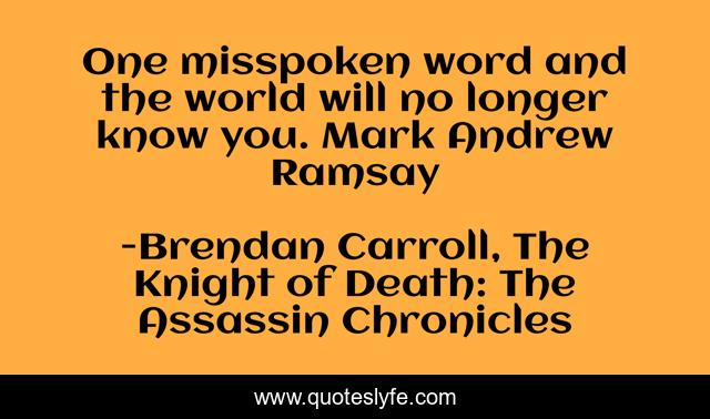 This page presents the quote "One misspoken word and the world will no longer know you. Mark Andrew Ramsay". Author of this quote is Brendan Carroll, The Knight of Death: The Assassin Chronicles. This quote is about magic, swords, fairies, dragons, fantasy, templars,.
