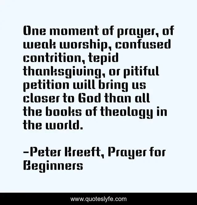 This page presents the quote "One moment of prayer, of weak worship, confused contrition, tepid thanksgiving, or pitiful petition will bring us closer to God than all the books of theology in the world.". Author of this quote is Peter Kreeft, Prayer for Beginners. This quote is about thanksgiving, worship, contrition, prayer,.