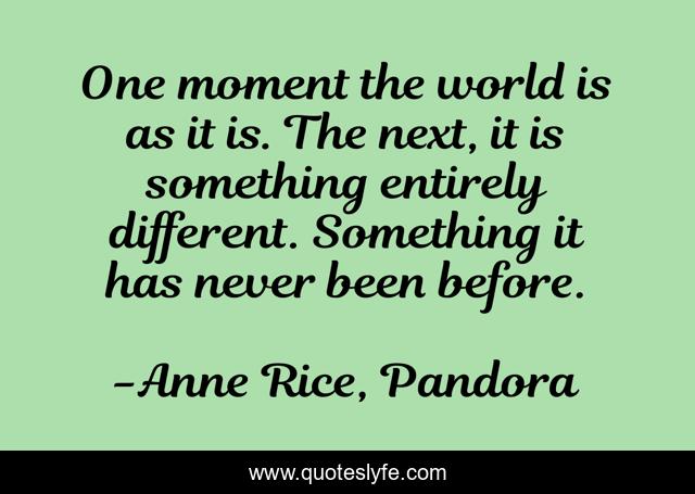 This page presents the quote "One moment the world is as it is. The next, it is something entirely different. Something it has never been before.". Author of this quote is Anne Rice, Pandora. .