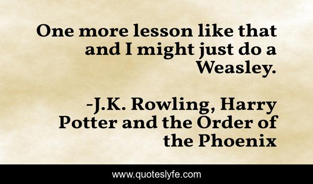 This page presents the quote "One more lesson like that and I might just do a Weasley.". Author of this quote is J.K. Rowling, Harry Potter and the Order of the Phoenix. This quote is about funny, comedy, weasley-twins,.