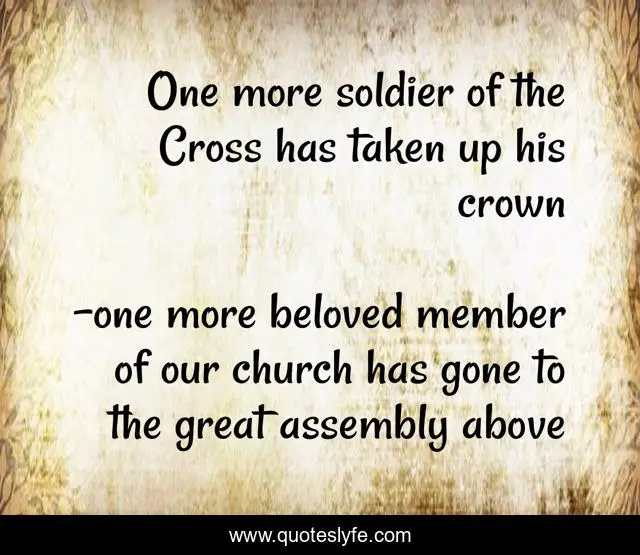 This page presents the quote "One more soldier of the Cross has taken up his crown". Author of this quote is one more beloved member of our church has gone to the great assembly above. .
