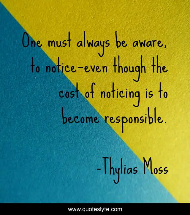 This page presents the quote "One must always be aware, to notice—even though the cost of noticing is to become responsible.". Author of this quote is Thylias Moss. This quote is about observation, observant, maturity, responsibility, growing-up, awareness, witnessing,.