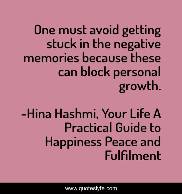 This page presents the quote "One must avoid getting stuck in the negative memories because these can block personal growth.". Author of this quote is Hina Hashmi, Your Life A Practical Guide to Happiness Peace and Fulfilment. This quote is about stuck-in-my-mind, memories, personal-growth,.