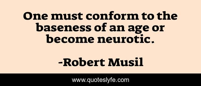 This page presents the quote "One must conform to the baseness of an age or become neurotic.". Author of this quote is Robert Musil. This quote is about conforming, individual-vs-society, societal-norms, immorality, neurosis, neuroticism, fitting-in, conforming-and-attitude, societal-expectations,.