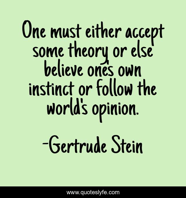 This page presents the quote "One must either accept some theory or else believe one's own instinct or follow the world's opinion.". Author of this quote is Gertrude Stein. .