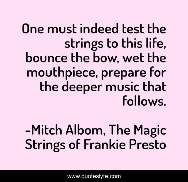This page presents the quote "One must indeed test the strings to this life, bounce the bow, wet the mouthpiece, prepare for the deeper music that follows.". Author of this quote is Mitch Albom, The Magic Strings of Frankie Presto. This quote is about enthusiasm, life, music, inspirational,.