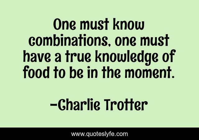 This page presents the quote "One must know combinations, one must have a true knowledge of food to be in the moment.". Author of this quote is Charlie Trotter. This quote is about food, moment,.