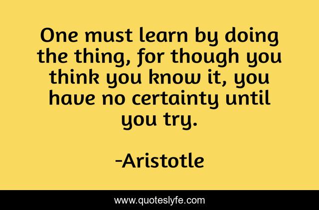This page presents the quote "One must learn by doing the thing, for though you think you know it, you have no certainty until you try.". Author of this quote is Aristotle. This quote is about try, certainty, learning,.