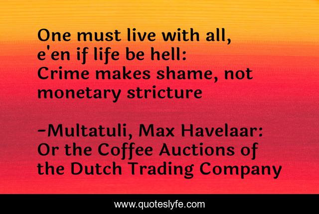 This page presents the quote "One must live with all, e'en if life be hell: Crime makes shame, not monetary stricture". Author of this quote is Multatuli, Max Havelaar: Or the Coffee Auctions of the Dutch Trading Company. This quote is about shame, monetary-stricture, crime,.