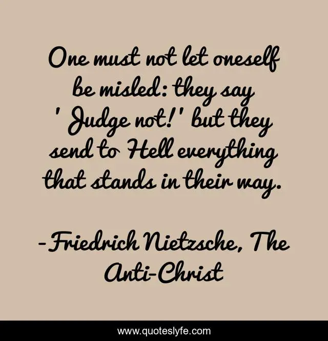 This page presents the quote "One must not let oneself be misled: they say 'Judge not!' but they send to Hell everything that stands in their way.". Author of this quote is Friedrich Nietzsche, The Anti-Christ. This quote is about judgement, existentialism,.
