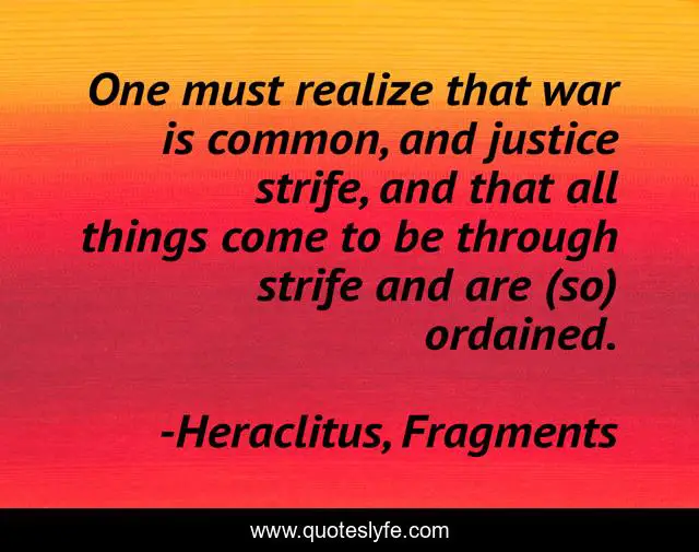 This page presents the quote "One must realize that war is common, and justice strife, and that all things come to be through strife and are (so) ordained.". Author of this quote is Heraclitus, Fragments. This quote is about justice, war, strife,.