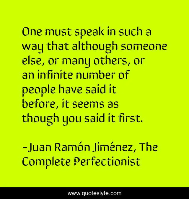 This page presents the quote "One must speak in such a way that although someone else, or many others, or an infinite number of people have said it before, it seems as though you said it first.". Author of this quote is Juan Ramón Jiménez, The Complete Perfectionist. This quote is about poems, poetry,.