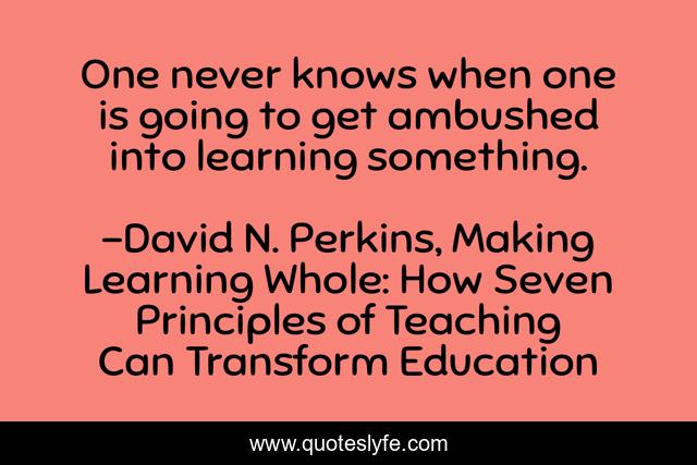 This page presents the quote "One never knows when one is going to get ambushed into learning something.". Author of this quote is David N. Perkins, Making Learning Whole: How Seven Principles of Teaching Can Transform Education. .