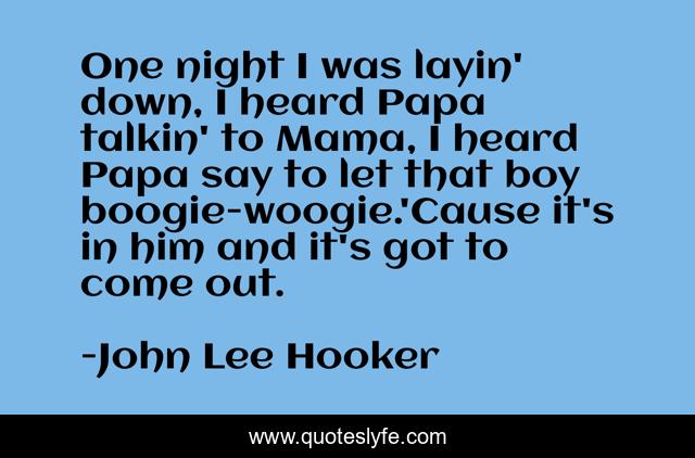 This page presents the quote "One night I was layin' down, I heard Papa talkin' to Mama, I heard Papa say to let that boy boogie-woogie.'Cause it's in him and it's got to come out.". Author of this quote is John Lee Hooker. This quote is about genius, inspiration,.