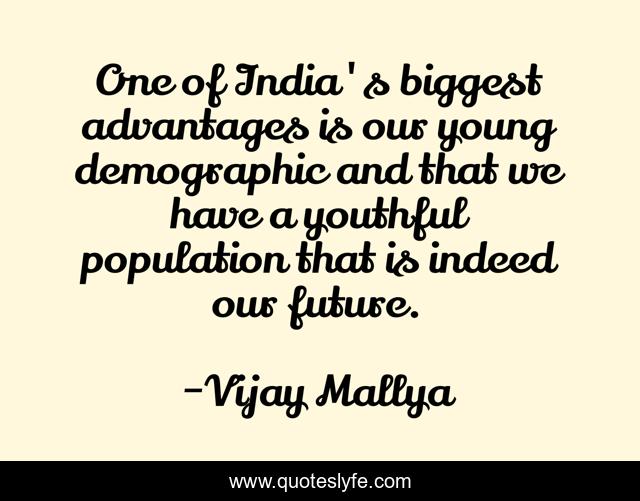 This page presents the quote "One of India's biggest advantages is our young demographic and that we have a youthful population that is indeed our future.". Author of this quote is Vijay Mallya. This quote is about india, demographic, young,.