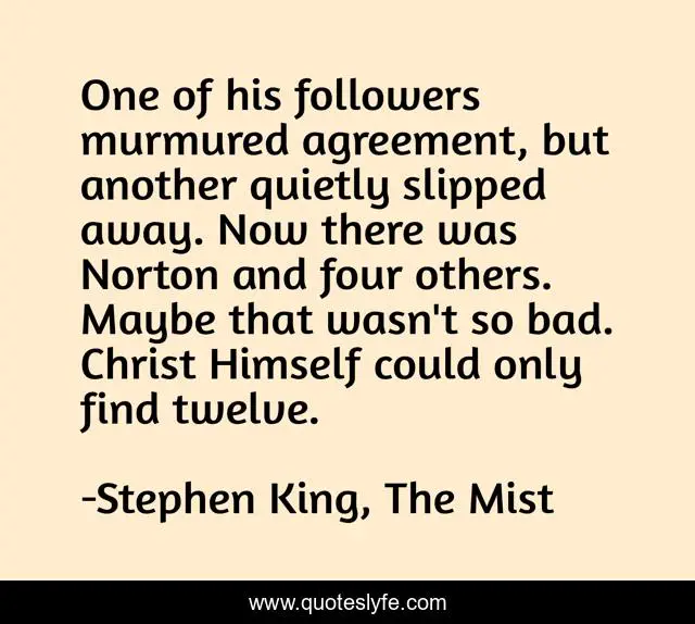 This page presents the quote "One of his followers murmured agreement, but another quietly slipped away. Now there was Norton and four others. Maybe that wasn't so bad. Christ Himself could only find twelve.". Author of this quote is Stephen King, The Mist. This quote is about fantasy, humor, science,.