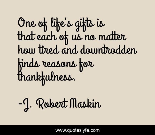 This page presents the quote "One of life's gifts is that each of us no matter how tired and downtrodden finds reasons for thankfulness.". Author of this quote is J. Robert Maskin. .