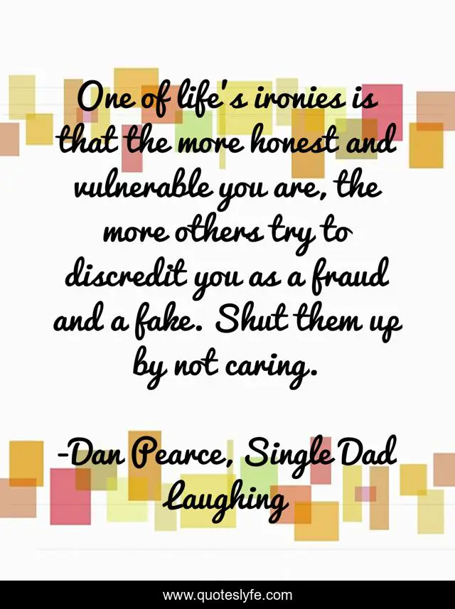 This page presents the quote "One of life’s ironies is that the more honest and vulnerable you are, the more others try to discredit you as a fraud and a fake. Shut them up by not caring.". Author of this quote is Dan Pearce, Single Dad Laughing. This quote is about insecurity, irony, honesty, fake-people, frauds,.