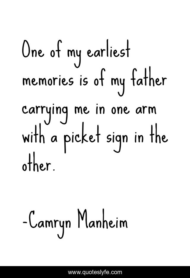 This page presents the quote "One of my earliest memories is of my father carrying me in one arm with a picket sign in the other.". Author of this quote is Camryn Manheim. This quote is about me, memories, father,.