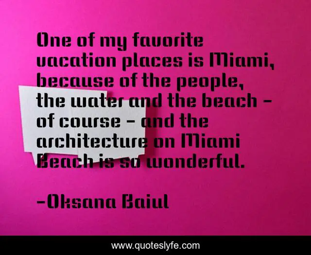 This page presents the quote "One of my favorite vacation places is Miami, because of the people, the water and the beach - of course - and the architecture on Miami Beach is so wonderful.". Author of this quote is Oksana Baiul. This quote is about water, beach, vacation,.