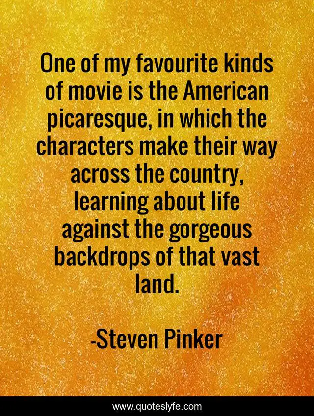 This page presents the quote "One of my favourite kinds of movie is the American picaresque, in which the characters make their way across the country, learning about life against the gorgeous backdrops of that vast land.". Author of this quote is Steven Pinker. This quote is about country, life, american,.