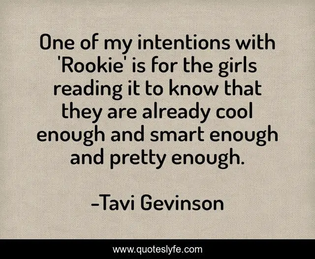 This page presents the quote "One of my intentions with 'Rookie' is for the girls reading it to know that they are already cool enough and smart enough and pretty enough.". Author of this quote is Tavi Gevinson. This quote is about reading, smart,.