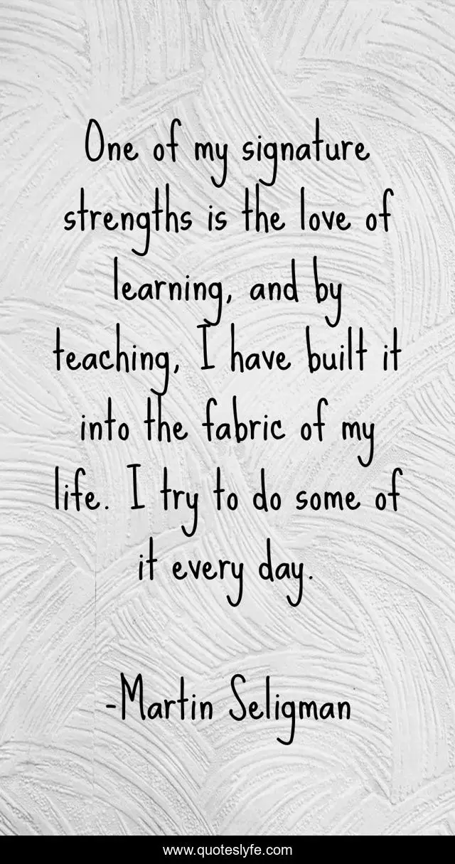 This page presents the quote "One of my signature strengths is the love of learning, and by teaching, I have built it into the fabric of my life. I try to do some of it every day.". Author of this quote is Martin Seligman. This quote is about life, love, day, affection,.