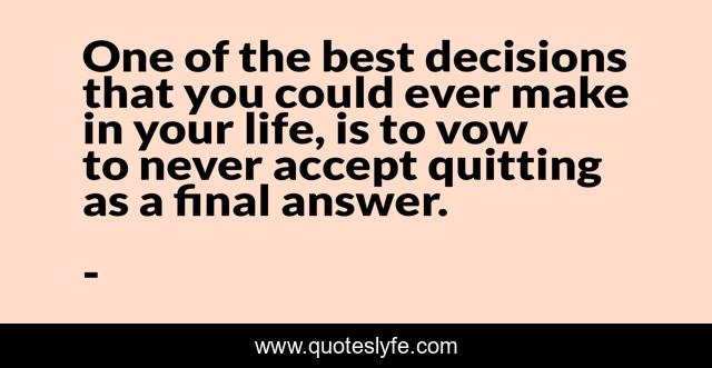 This page presents the quote "One of the best decisions that you could ever make in your life, is to vow to never accept quitting as a final answer.". Author of this quote is . This quote is about dare-to-never-quit, quit, edmond-mbiaka, vow-to-never-quit, quitters, quitting-is-not-a-final-answer, quitting,.