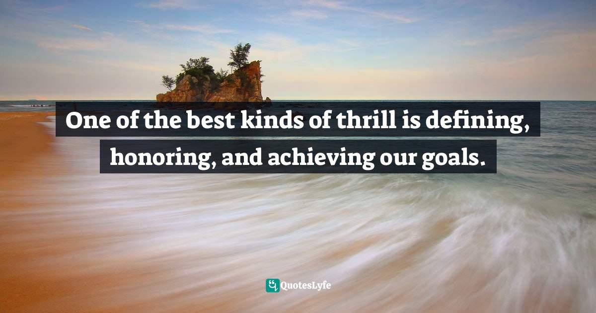 This page presents the quote "One of the best kinds of thrill is defining, honoring, and achieving our goals.". Author of this quote is Gina Greenlee, Postcards and Pearls: Life Lessons from Solo Moments on the Road. This quote is about achieving-excellence, goal-setting-tips, thrill, goals-in-life, inspiring-thoughts, achieving-dreams, achieving-greatness, inspiring-authors, inspirational-attitude,.