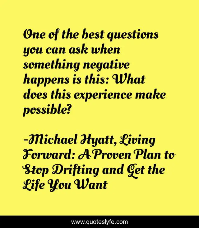 This page presents the quote "One of the best questions you can ask when something negative happens is this: What does this experience make possible?". Author of this quote is Michael Hyatt, Living Forward: A Proven Plan to Stop Drifting and Get the Life You Want. This quote is about personal-development, possibility, intentional-living, questions, life-plan,.