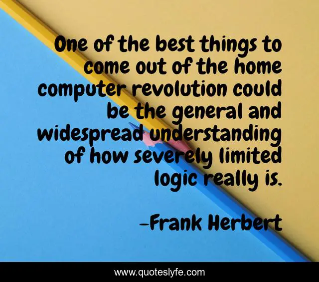 This page presents the quote "One of the best things to come out of the home computer revolution could be the general and widespread understanding of how severely limited logic really is.". Author of this quote is Frank Herbert. This quote is about understanding, best, logic,.
