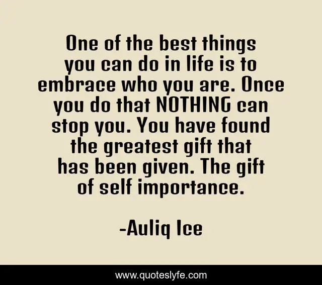 This page presents the quote "One of the best things you can do in life is to embrace who you are. Once you do that NOTHING can stop you. You have found the greatest gift that has been given. The gift of self importance.". Author of this quote is Auliq Ice. This quote is about being-who-you-are, empowerment, acceptance, success, finding-yourself, be-yourself, positive, self-importance, motivational,.