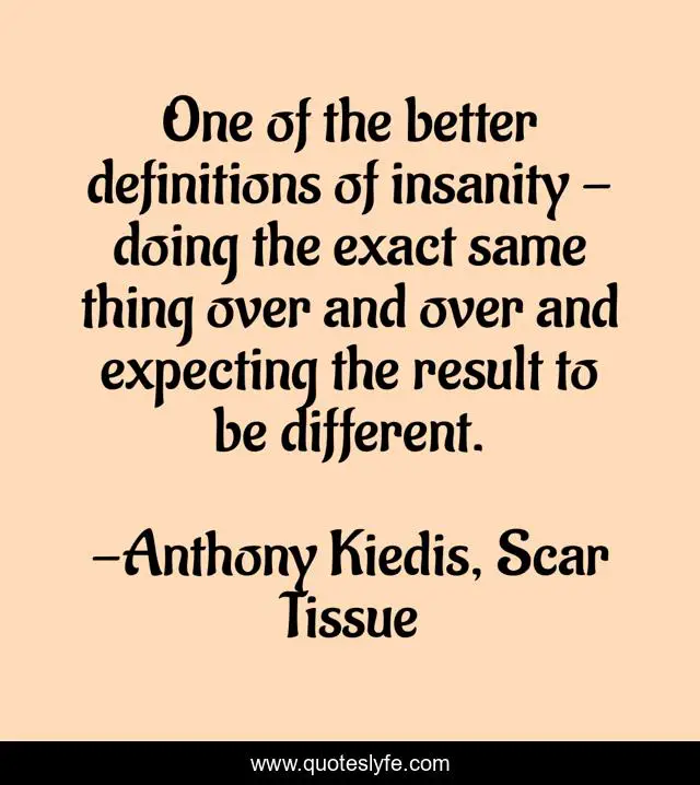 This page presents the quote "One of the better definitions of insanity - doing the exact same thing over and over and expecting the result to be different.". Author of this quote is Anthony Kiedis, Scar Tissue. This quote is about misattributed-to-einstein, paraphrasing-narcotics-anonymous, insanity,.