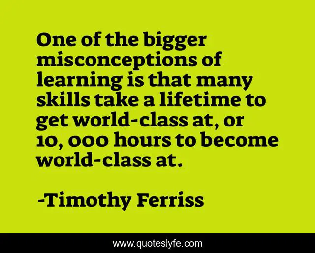 This page presents the quote "One of the bigger misconceptions of learning is that many skills take a lifetime to get world-class at, or 10, 000 hours to become world-class at.". Author of this quote is Timothy Ferriss. This quote is about skills, hours, bigger,.