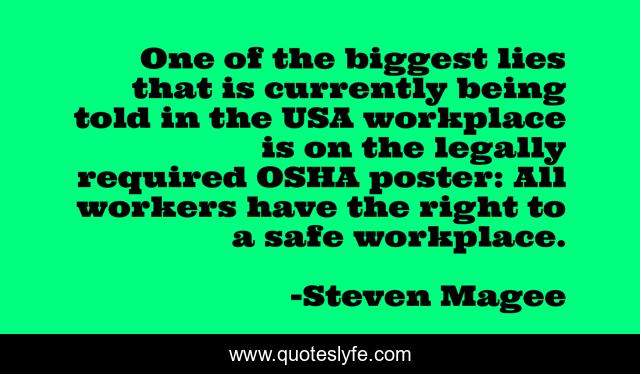 This page presents the quote "One of the biggest lies that is currently being told in the USA workplace is on the legally required OSHA poster: All workers have the right to a safe workplace.". Author of this quote is Steven Magee. This quote is about right, telescope, astronomical, lies, astronomer, astrobiology, solar-energy, solar-pv, lie,.