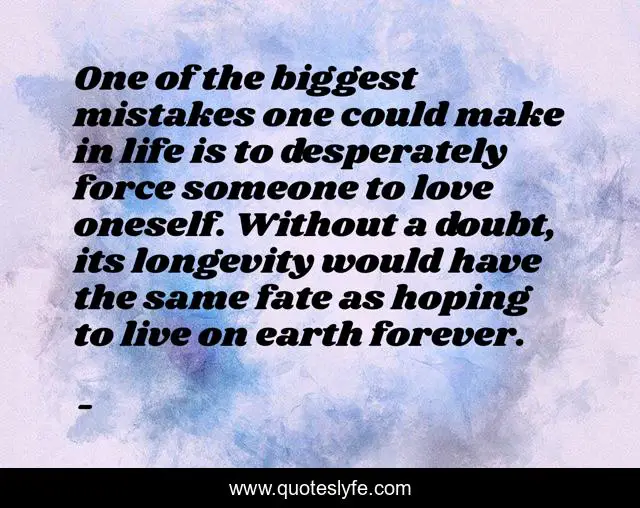 This page presents the quote "One of the biggest mistakes one could make in life is to desperately force someone to love oneself. Without a doubt, its longevity would have the same fate as hoping to live on earth forever.". Author of this quote is . This quote is about edmond-mbiaka, big-mistake-in-life, forcing-someone-to-love-you, stop-forcing-others-to-love-you, making-a-big-mistake-in-life, never-force-anyone-to-love-you,.